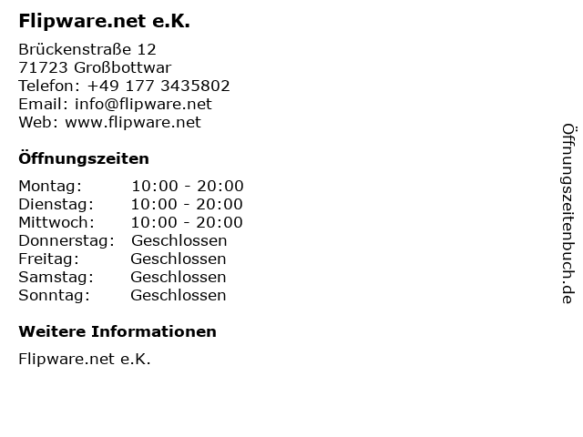 | Öffnungszeiten Flipware.net e.K. in Großbottwar anzeigen | |
