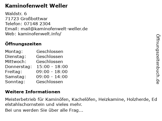 Öffnungszeiten Kaminofenwelt Weller in Großbottwar anzeigen | |