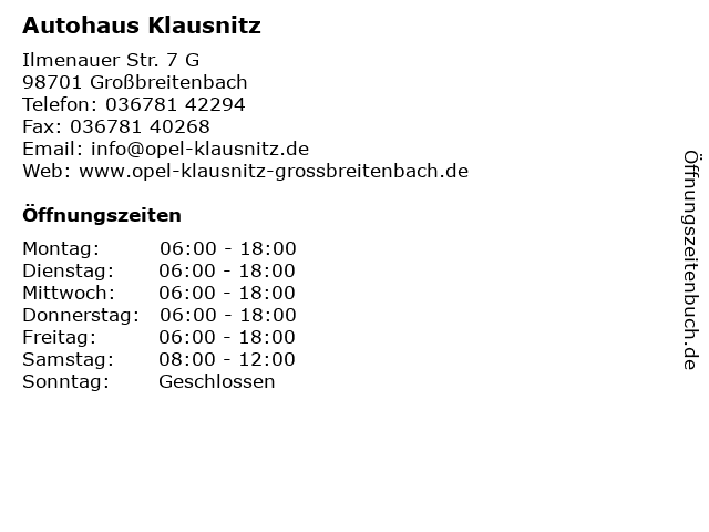 | Öffnungszeiten Autohaus Klausnitz in Großbreitenbach anzeigen | |