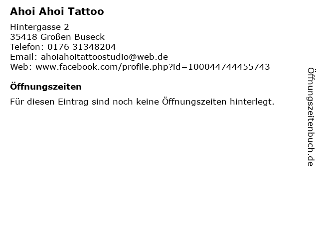 | Öffnungszeiten Ahoi Ahoi Tattoo in Großen Buseck anzeigen | |