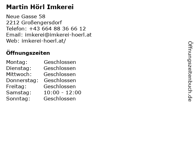 | Öffnungszeiten Martin Hörl Imkerei in Großengersdorf anzeigen | |