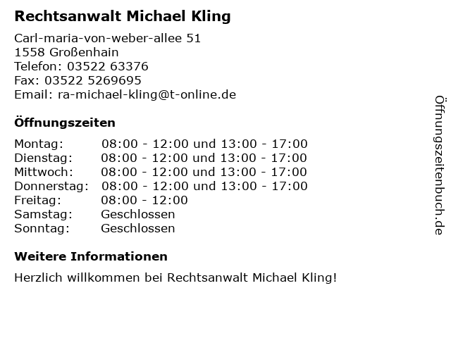 | Öffnungszeiten Rechtsanwalt Michael Kling in Großenhain anzeigen | |