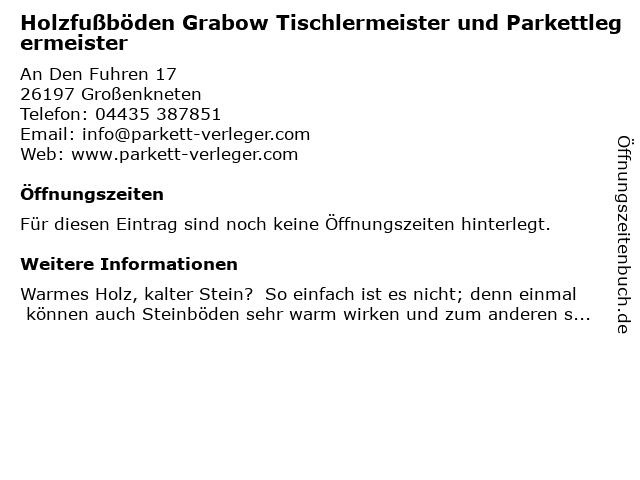 1 Holzfußböden Grabow Tischlermeister und Parkettlegermeister (Entfernung: 0,02 km) An den Fuhren 17, 26197 Großenkneten 2 Uwe Johannsen Energetischer Berater Dipl.-Betriebswirt Tischlermeister Johannsen Bau- und Möbeltischler Bodenbeläge Fensterbau (Entfernung: 12,40 km) Neuländer Str. 20, 26209 Hatten 6 |