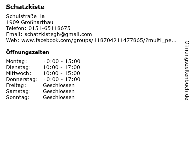 | Öffnungszeiten Schatzkiste in Großharthau anzeigen | |