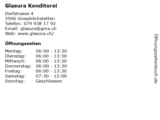 | Öffnungszeiten Glasura Konditorei in Grosshöchstetten anzeigen | |