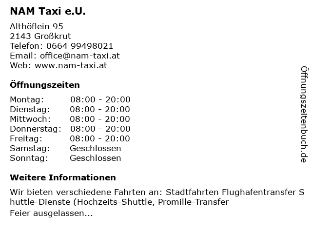 Öffnungszeiten NAM Taxi e.U. in Großkrut anzeigen | |