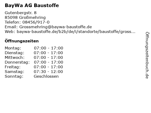 | Öffnungszeiten BayWa AG Baustoffe in Großmehring anzeigen | |