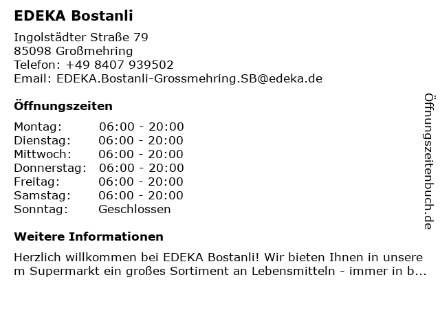 | Öffnungszeiten EDEKA Bostanli in Großmehring anzeigen | |