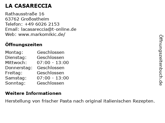 | Öffnungszeiten LA CASARECCIA in Großostheim anzeigen | |
