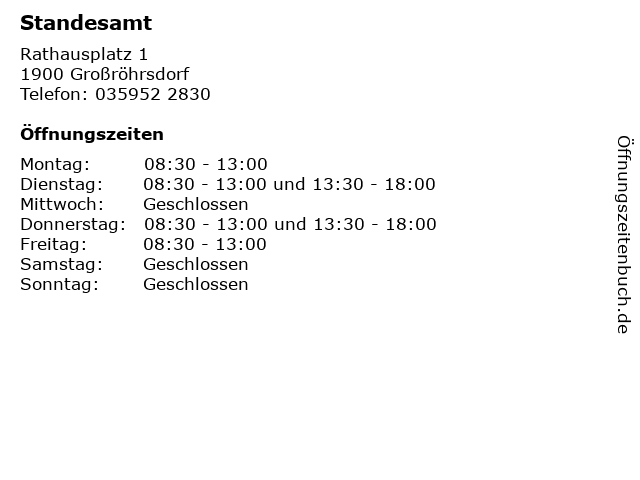 | Öffnungszeiten Standesamt in Großröhrsdorf anzeigen | |