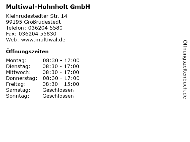 | Öffnungszeiten Multiwal-Hohnholt GmbH in Großrudestedt anzeigen | |