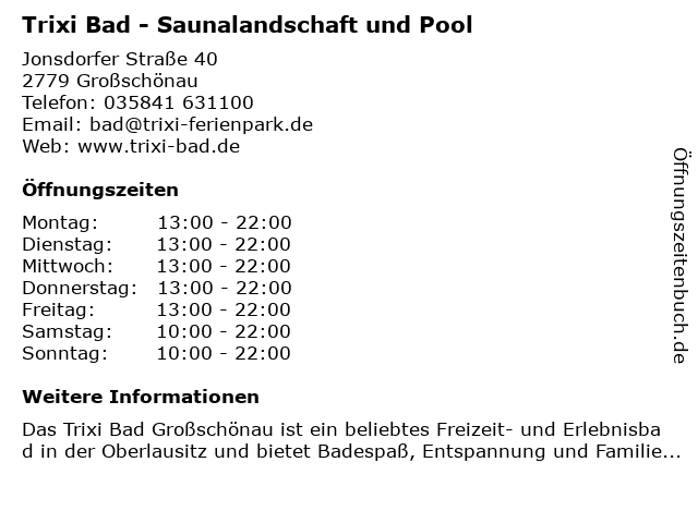 5 Trixi Ferienpark - Sauna (Oktober bis April) (Entfernung: 0,72 km) Jonsdorfer Straße 40, 02779 Großschönau 6 Trixi Ferienpark - Sauna (Mai bis September) (Entfernung: 0,72 km) Jonsdorfer Straße 40, 02779 Großschönau |