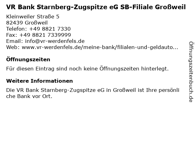 | VR Bank Starnberg-Zugspitze eG SB-Filiale Großweil anrufen | |