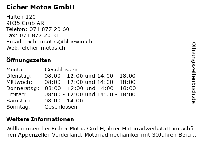 | Öffnungszeiten Eicher Motos GmbH in Grub AR anzeigen | |