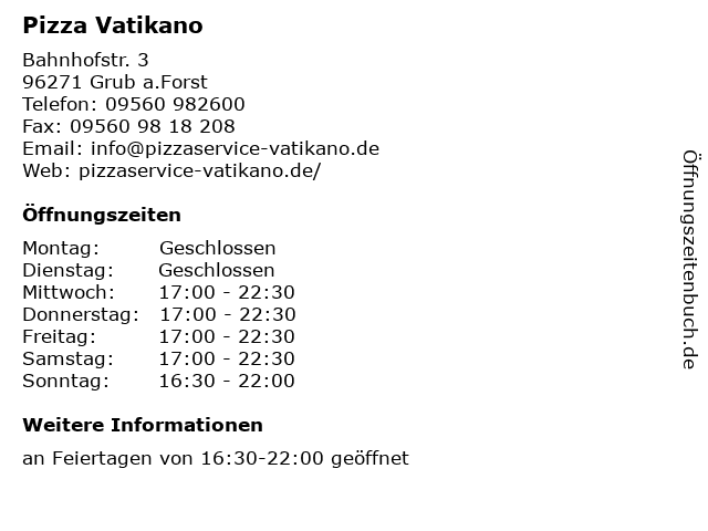 | Öffnungszeiten Pizza Vatikano in Grub a.Forst anzeigen | |