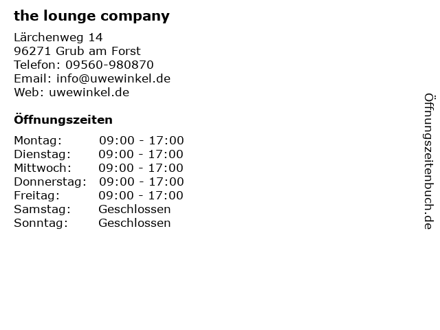 | Öffnungszeiten the lounge company in Grub am Forst anzeigen | |