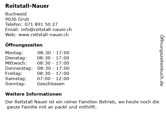 | Öffnungszeiten Reitstall-Nauer in Grub anzeigen | |