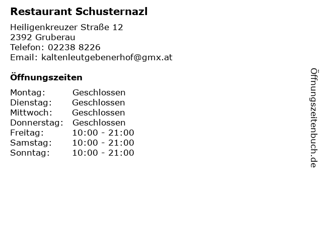 | Öffnungszeiten Restaurant Schusternazl in Gruberau anzeigen | |