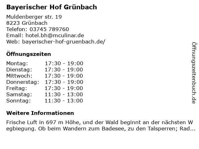 | Öffnungszeiten Bayerischer Hof Grünbach in Grünbach anzeigen | |