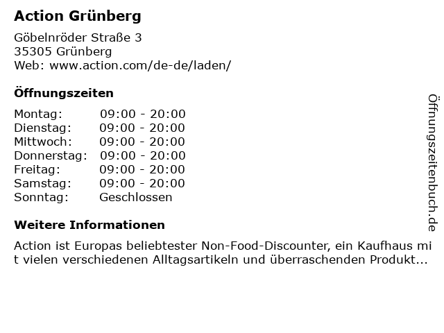 | Öffnungszeiten Action Grünberg in Grünberg anzeigen | |