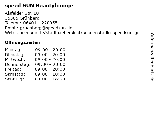 | Öffnungszeiten speed SUN Beautylounge in Grünberg anzeigen | |
