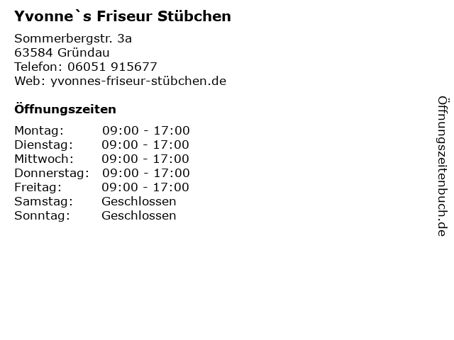 | Öffnungszeiten Yvonne`s Friseur Stübchen in Gründau anzeigen | |