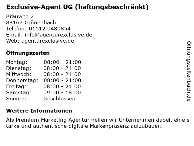 Branchen & Suchbegriffe zu Exclusive-Agent UG (haftungsbeschränkt):agent, e-commerce-dienst, exclusive, filmstudio, haftungsbeschränkt, pr-unternehmen, ug, videoproduktion, webdesigner |