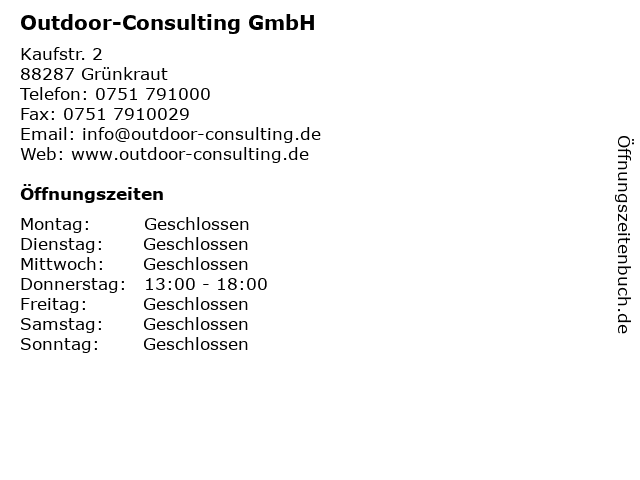 | Öffnungszeiten Outdoor-Consulting GmbH in Grünkraut anzeigen | |