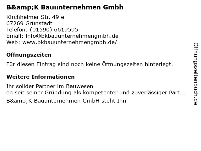 | Öffnungszeiten B&K Bauunternehmen Gmbh in Grünstadt anzeigen | |