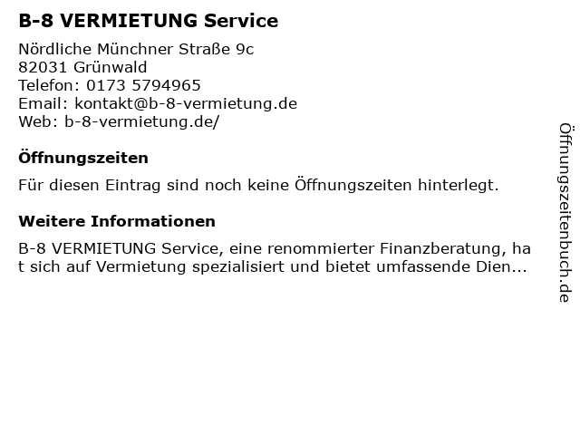 | Öffnungszeiten B-8 VERMIETUNG Service in Grünwald anzeigen | |