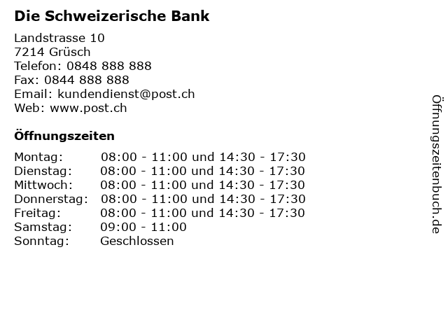 | Öffnungszeiten Die Schweizerische Bank in Grüsch anzeigen | |