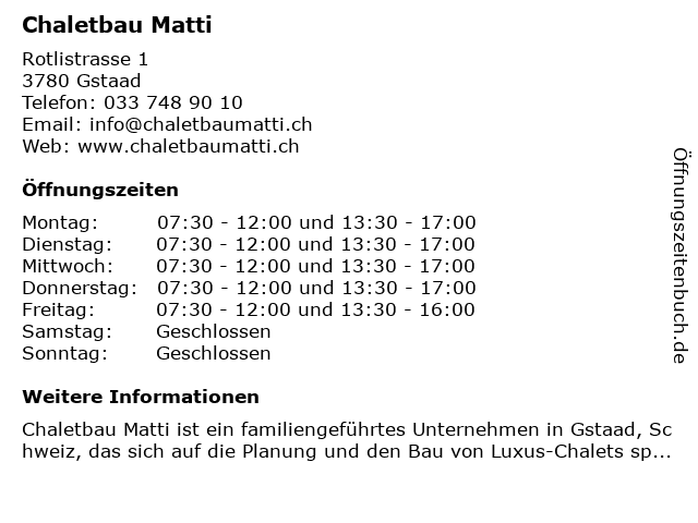 | Öffnungszeiten Chaletbau Matti in Gstaad anzeigen | |