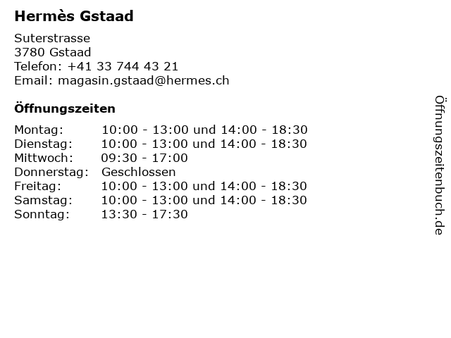 | Öffnungszeiten Hermès Gstaad in Gstaad anzeigen | |