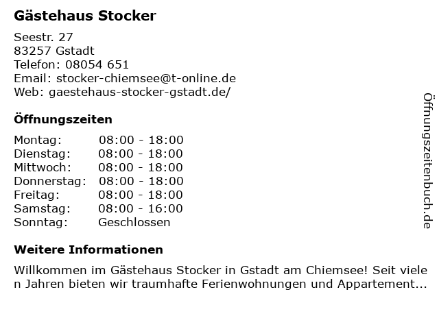 | Öffnungszeiten Gästehaus Stocker in Gstadt anzeigen | |