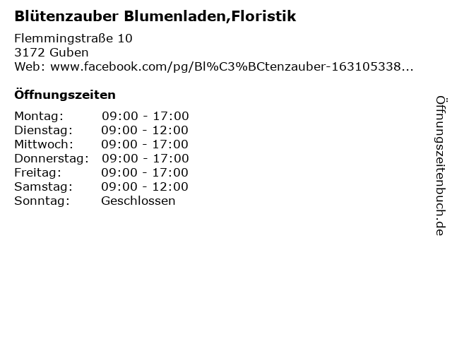 | Öffnungszeiten Blütenzauber Blumenladen,Floristik in Guben anzeigen | |