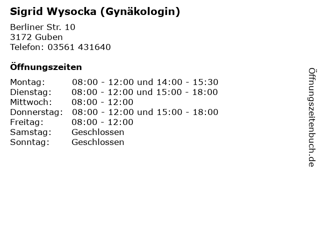 | Öffnungszeiten Sigrid Wysocka (Gynäkologin) in Guben anzeigen | |
