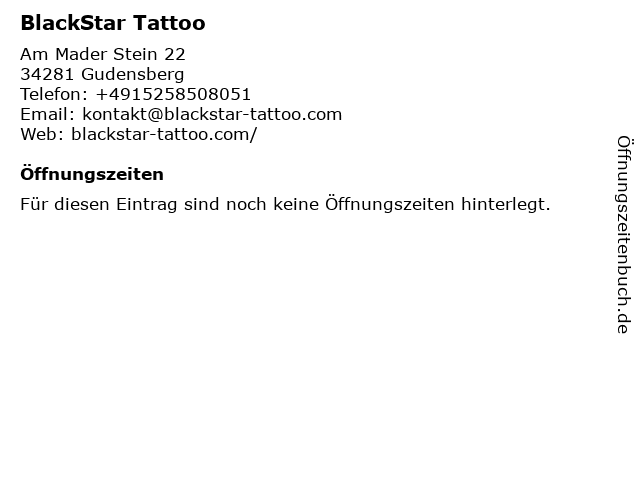 | Öffnungszeiten BlackStar Tattoo in Gudensberg anzeigen | |