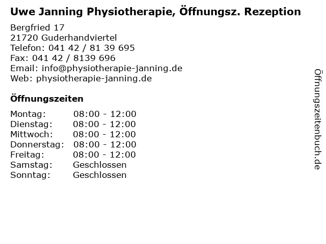 Branchen & Suchbegriffe zu Uwe Janning Physiotherapie, Öffnungsz. Rezeption:janning, physiotherapie, rezeption, uwe, öffnungsz. |