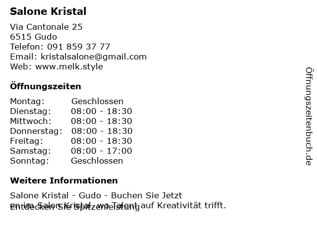 | Öffnungszeiten Salone Kristal in Gudo anzeigen | |