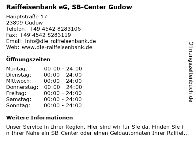 5 Raiffeisenbank eG, Geschäftsstelle Zarrentin (Entfernung: 9,70 km) Amtsstraße 2d, 19246 Zarrentin am Schaalsee 6 Raiffeisenbank eG, SB-Center Breitenfelde (Entfernung: 10,83 km) Borstorfer Straße 2, 23881 Breitenfelde |