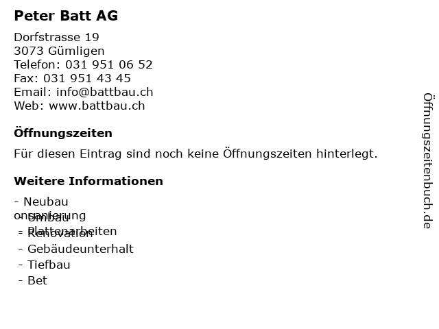 | Öffnungszeiten Peter Batt AG in Gümligen anzeigen | |