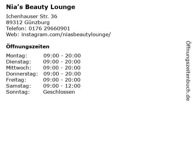| Öffnungszeiten Nia’s Beauty Lounge in Günzburg anzeigen | |