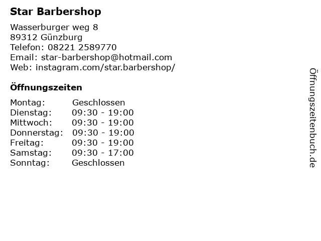 | Öffnungszeiten Star Barbershop in Günzburg anzeigen | |