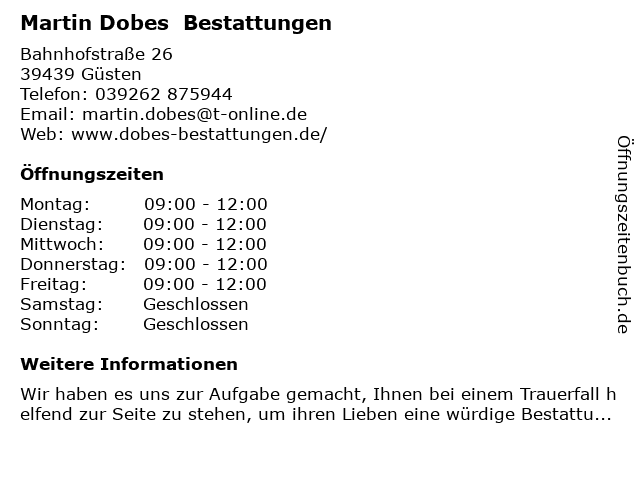 | Öffnungszeiten Martin Dobes Bestattungen in Güsten anzeigen | |