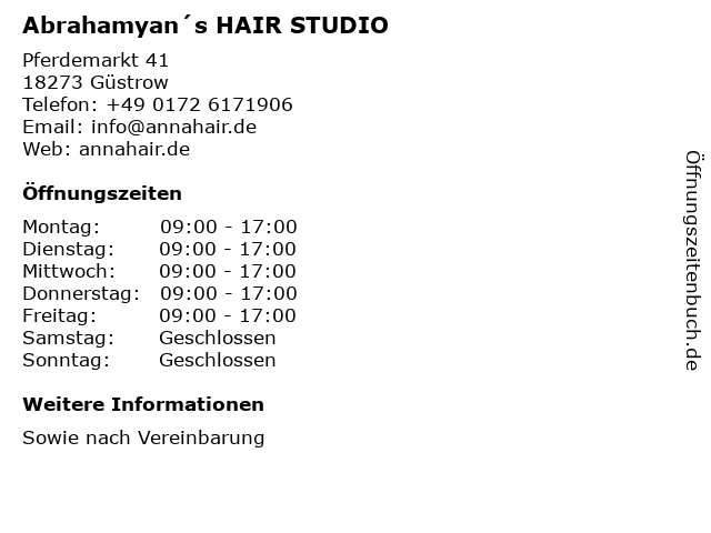 | Öffnungszeiten Abrahamyan´s HAIR STUDIO in Güstrow anzeigen | |