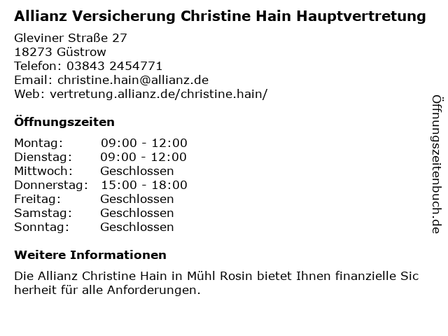 3 Allianz Versicherung -Hauptvertretung Marco Drenckhan (Entfernung: 0,86 km) Feldstr. 20, 18273 Güstrow 5 Allianz Versicherung Christian Hain Hauptvertretung in Güstrow - Plauer Vorstadt (Entfernung: 1,00 km) Plauer Str.51 , 18273 Güstrow 6 |