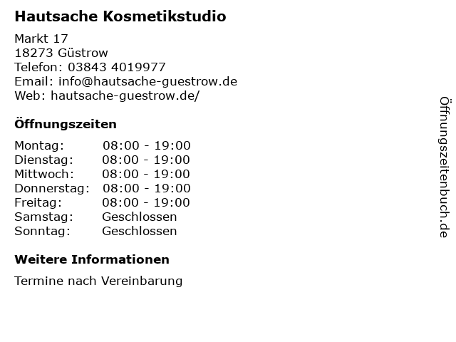 | Öffnungszeiten Hautsache Kosmetikstudio in Güstrow anzeigen | |