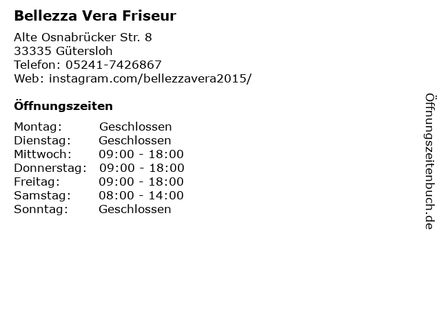 | Öffnungszeiten Bellezza Vera Friseur in Gütersloh anzeigen | |