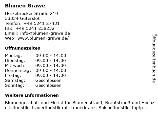 | Öffnungszeiten Blumen Grawe in Gütersloh anzeigen | |