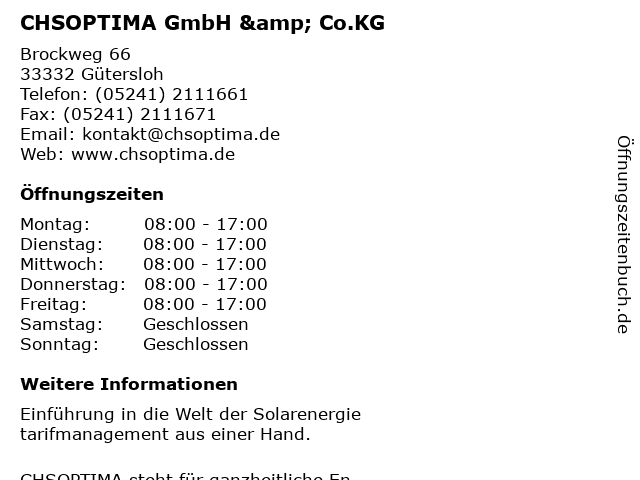 | Öffnungszeiten CHSOPTIMA GmbH & Co.KG in Gütersloh anzeigen | |
